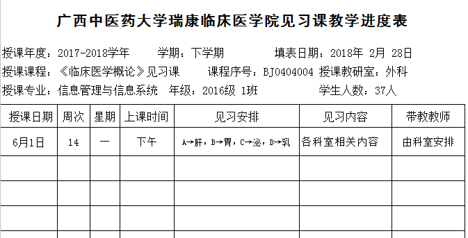 2017-2018下16信息管理与信息系统《临床医学概论》见习进度表