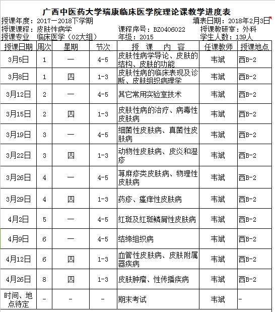 2017~2018下15级临床医学专业《皮肤性病学》理论课进度表
