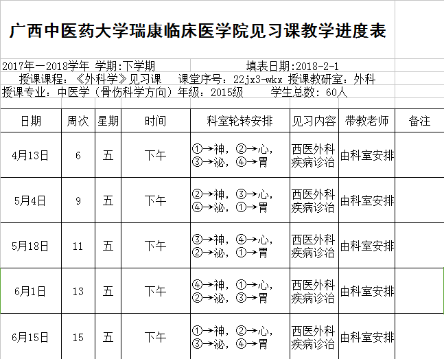 2017-2018下15级骨伤《外科学》见习进度表