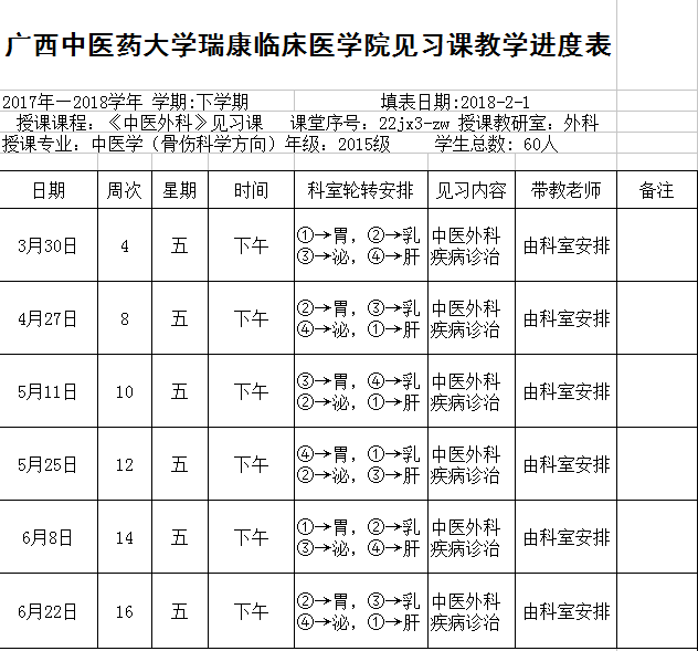 2017-2018下15级骨伤《中医外科》见习进度表