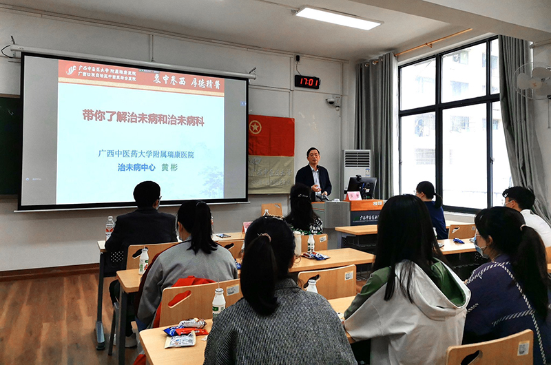 活动中,疫情防控、急救知识、养生保健、雷锋精神4个小组代表先后上台,以演讲的形式展示并介绍了近期各小组成员细心查找和梳理的知识。黄彬在点评中给同学们提出中肯建议,他说,医生是活到老学到老的职业,不论讲授者水平如何,都应该认真地听,取其所长,补己之短,方能不断进步。黄彬指出,“演讲要有交流,要有沟通,如果时间不允许讲完全面的内容,就要抓住其中的一点讲明、讲清、讲透”,随后黄彬做了“带你了解治未病和治未病科”主题讲座,他幽默的语言以及对中医的热爱和信心感染着大家,让大家在学习到专业知识的同时,领略到了高水平宣讲所应具备的素质和能力。