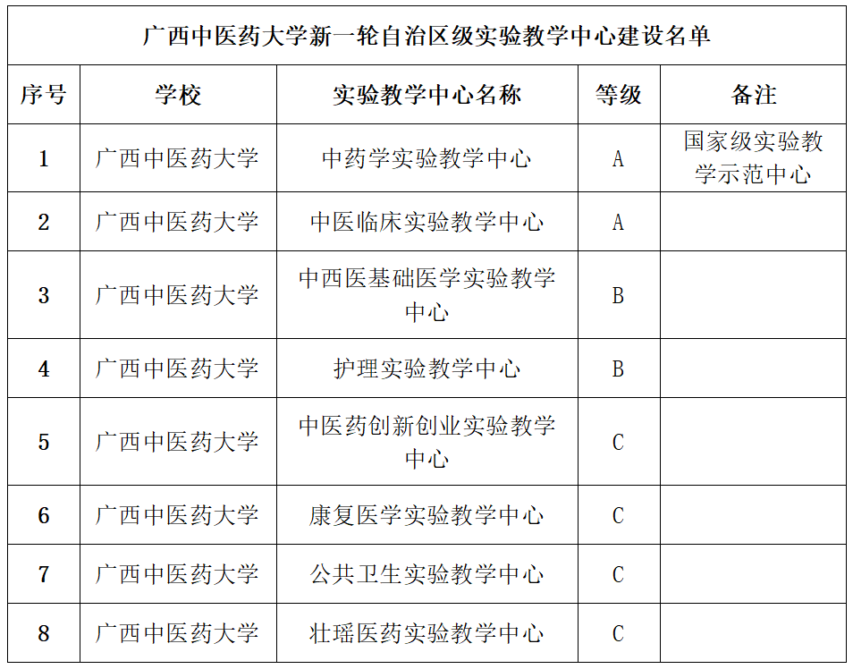 近日,根据《自治区教育厅关于公布新一轮自治区级实验教学中心建设名单的通知》(桂教高教〔2025〕6号),自治区教育厅公布了新一轮自治区级实验教学中心建设名单,点点体育中药学实验教学中心等8个实验教学中心成功入选。