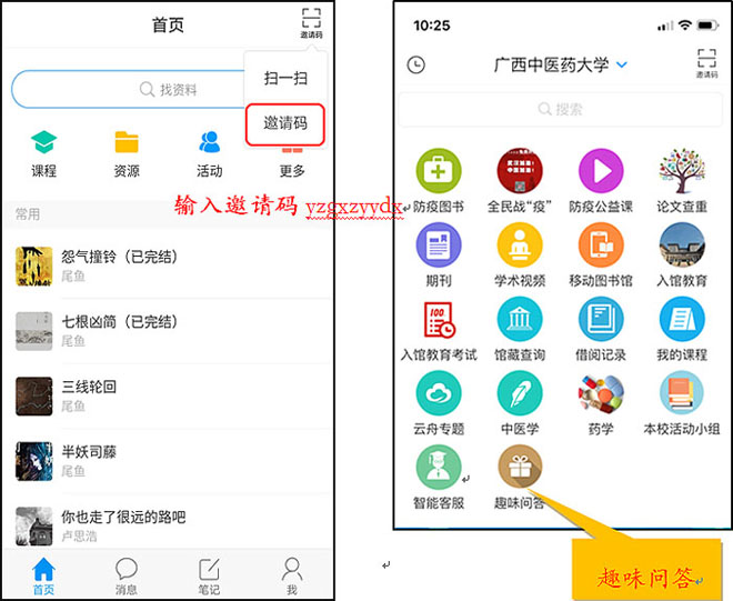 3.进入学习通点点体育首页后,点击右上角输入邀请码:yzgxzyydx;