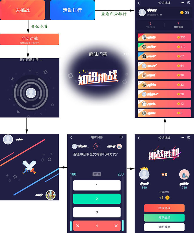 2.比赛流程:“去挑战”——进入“全网对战”——系统匹配对手——对战开始——竞答——挑战结果——继续挑战。