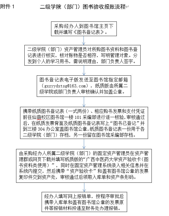 为进一步加强各二级学院(部门)图书采购的管理工作,经学校资产管理处、财务处、图书馆三个部门协商讨论决定,凡使用学校统一管理的项目经费购买的图书资料,需完成图书资料验收手续后,才能办理费用报销手续,主要步骤说明如下: