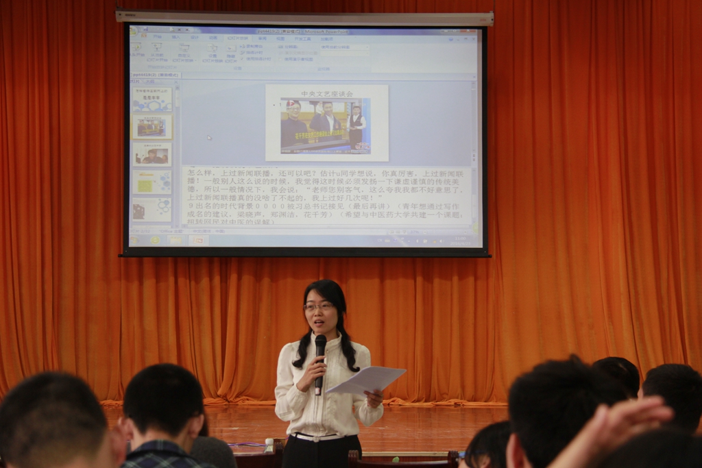 讲座伊始,主持人、校团委书记王春花简单的介绍了花千芳老师及其作品。在同学们热烈的掌声中,花老师走上舞台开始了今天的讲座。花老师就“网络投票、酒店女孩遇袭、山东假疫苗事件、校园暴力……”等众多网络热点新闻、时事以多方面的角度表达了他的看法和见解,剖析了网络热点新闻产生的原因及其背后的涵义。讲座中,花老师运用幽默风趣的语言,多次和同学们进行互动,拉近了和同学们的距离。花老师通过举例的方式让同学们从不同的角度了解了互联网新闻,他表示:如今网络媒体泛滥、良莠不齐,各种夺人耳目的热点新闻层出不穷,真假难辨,混淆了大众的关注点,同学们应该学会辨别真假信息,不做假消息的传播者,不做负能量的传递者。