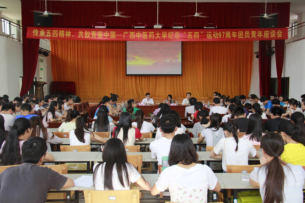 为传承“爱国、进步、民主、科学”的五四精神,树立优秀团员典型,充分发挥先进青年典型的示范带动作用,宣传弘扬青春正能量,校团委邀请了在各方面优秀团员青年为青年团员代表进行交流。优秀青年中医师夏天、获得2015年全国“自强之星”提名奖的研究生代表舒建龙、第四届全国中医优秀青年王雄将、国家奖学金获得者巫春乐、校十佳团支书梁丹、全区志愿服务先进集体—大学生红十字会副秘书长朱冯燕和获得2015年全国暑期社会实践立项团队“遇见老兵,温暖迟暮之年”的负责人蒋钟慧分别从各自成长经历和工作学习领域与青年团员进行亲切交流。