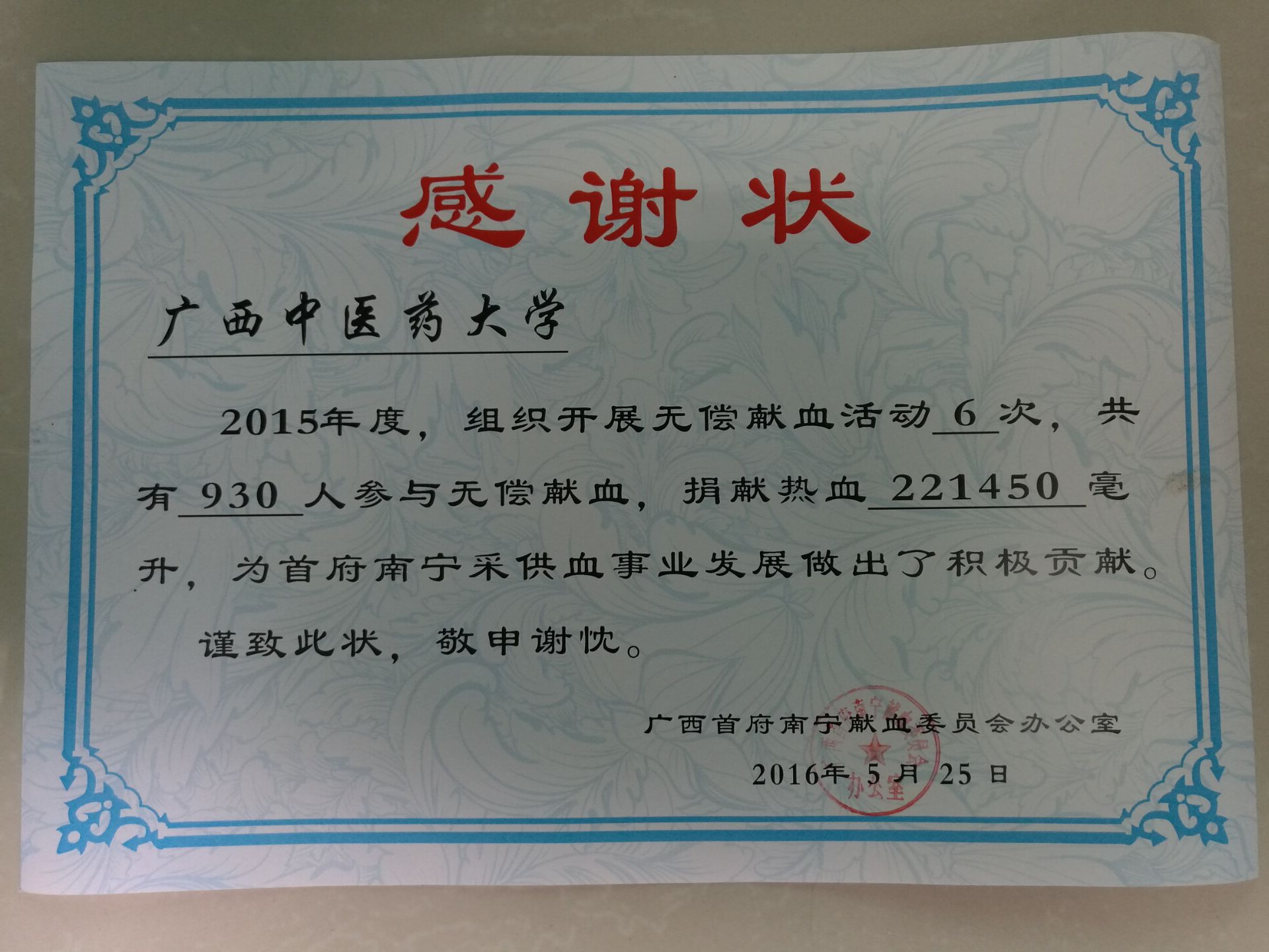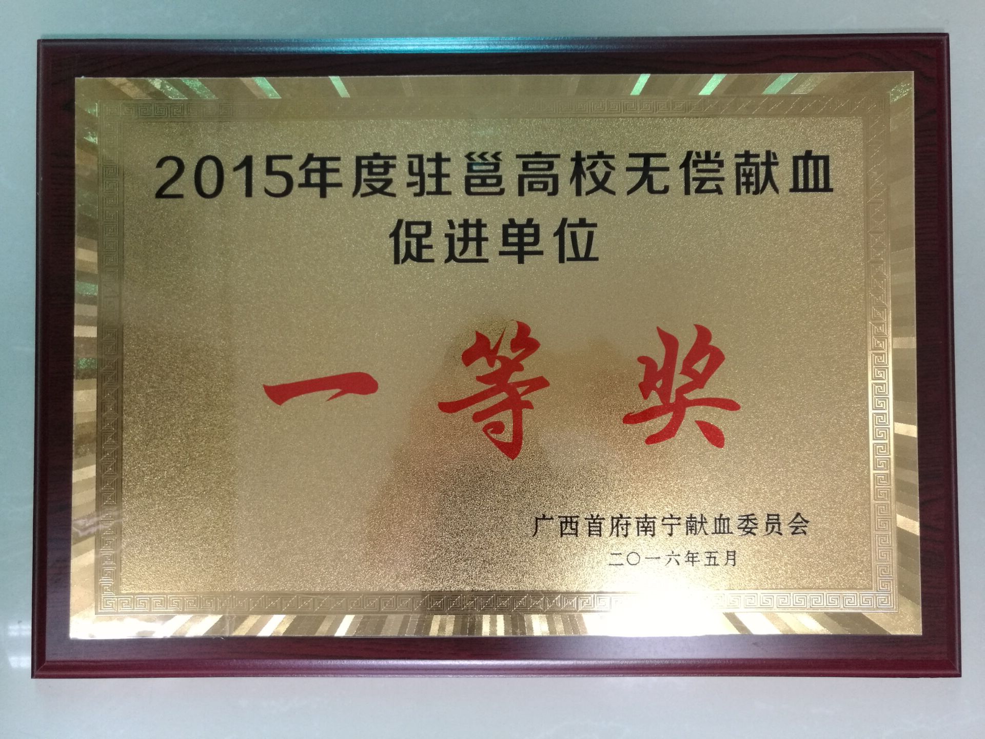 2015年度驻邕高校无偿献血促进单位一等奖