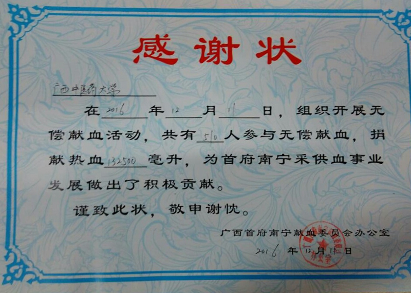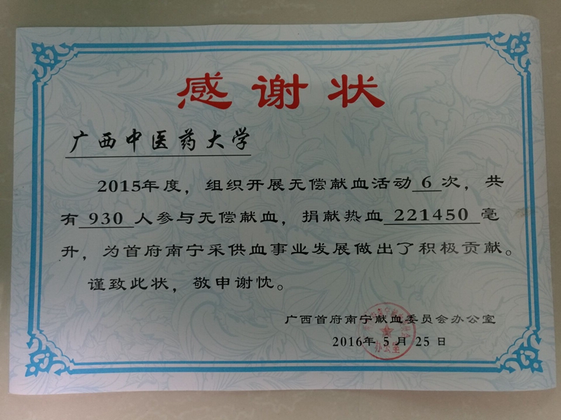 2016年,点点体育在仙葫校区和明秀校区共进行了6次血车进校志愿服务活动。献血人次1782人,献血量达448880ml,献血人数和献血量分别比去年增加152%和186%。献血人数占在校生比例约13.7%,创下了历史新高,同时在校生人数较少的情况下能够保持献血量在驻邕高校中排名第一。