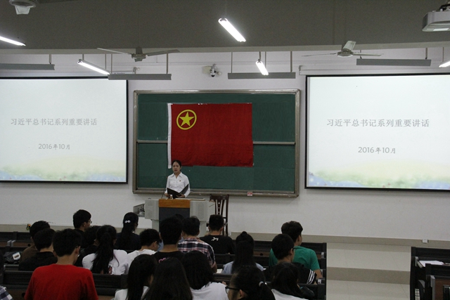 本次团课的内容主要有:学习党的理论创新历程、学习总书记系列讲话的重点内容、学习总书记系列讲话的理论品格。王老师首先带大家回顾了党95年来的理论创新历程,并对理论的主要内容、意义进行了详细解释。她着重向大家介绍了“四个全面战略布局”政策,从政策的目标、手段、保障、核心四个方面进行分析,并对“小康社会”、“中国梦”、“两个一百年”等概念进行精辟解读。最后得出“发展需要灵魂”、“改革才有出路”、“法治才是正道”的理念结论。