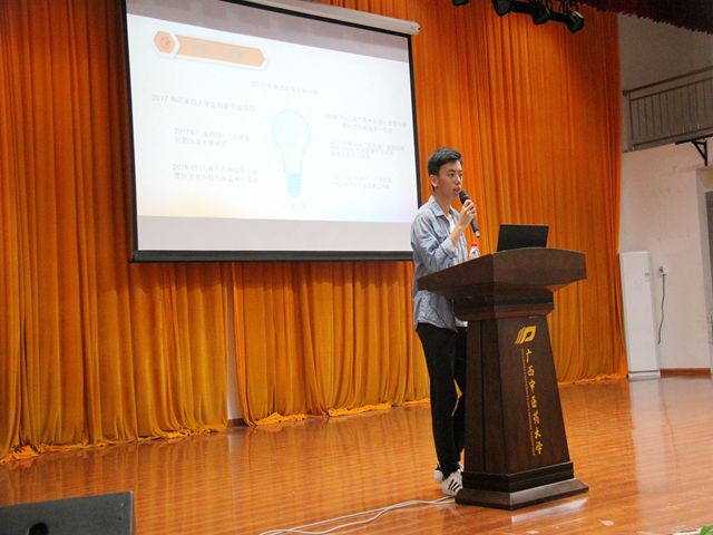 第二部分由陈晓东老师主讲,他对大学生创新创业训练项目、“互联网+”大学生创新创业大赛、taptap点点体育大学生课外学术科技作品竞赛、“远志杯”大学生课外学术科技作品竞赛、“挑战杯”大学生课外学术科技作品竞赛、“创青春”广西大学生创业大赛等创新创业赛事的申报要求、大赛流程、注意事项等内容做了全面而详细的说明,并激励同学们积极参与大学生创新创业活动,给有意向参与大学生创新创业活动的同学们指明了方向。讲座最后,陈晓东老师还分享了以往参加过创新创业活动的多个优秀项目,给我们以启迪。