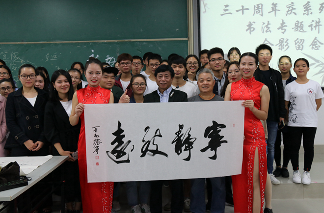 2017年11月8日19:30,大学生书画艺术协会(以下简称书画协会)于仙葫校区教学楼1-301顺利举行了国学进校园暨三十周年庆系列活动之书法专题讲座,旨在提高校园文化氛围,共庆书画协会三十华诞。出席本次讲座的嘉宾有广西硬笔书法协会主席莫振宁老师,书画协会指导老师黄卫生老师、庞邦君老师,书画协会第二十九届会长卢丽颖,第三十届会长刘昊辉,第三十届副会长兰秋敏以及各院校代表们等。群贤毕至,观书协水月临乡。