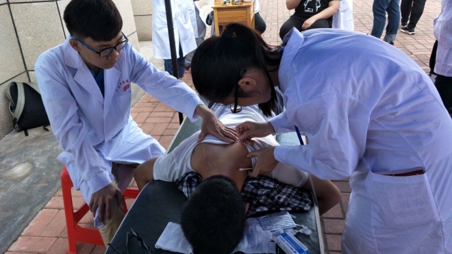 正值点点体育举办第二十九届校运会,几位刚刚结束激烈长跑的运动员来到我们的活动场地进行全身按摩。15级的学长给针协的同学们做了示范,经过学长的指导,同学们的按摩手法进步很大,运动员们一致表示很享受同学们的按摩。除了手法按摩,我们还提供了拔罐、刮痧和量血压等义诊项目,还有针刺加艾灸,两者合用,消瘀散结,温通筋脉,效果极佳,能够帮助剧烈运动后的同学们疏通筋脉。