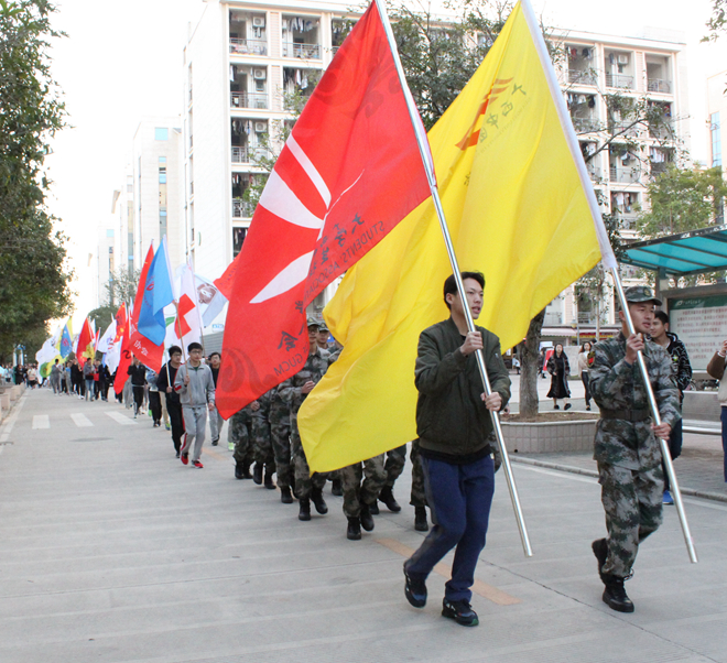 一声令下,500多名参与人员于大学生活动中心旁篮球场开始了本次环校长跑,以校旗和社联会旗为首的队伍依次出发,长跑途经篮球场——桂花路——三榕西路——格物路——歧伯西路——尊贤路——医圣广场——亲亲路——尚中路——桂花路——足球场。长跑健儿们精神抖擞,步伐稳健,一个个鱼贯前行的队伍组成了桂中医一道艳丽的风景线。
