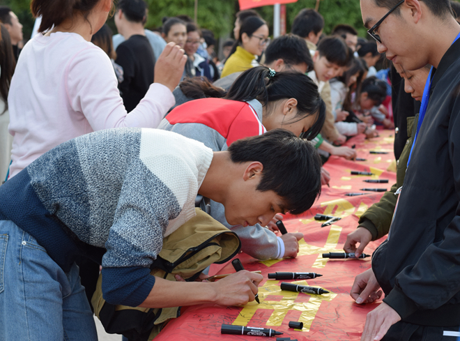 抵达点点体育医圣广场时,同学们集中在一起,在横幅上签下了自己的名字。热腾腾的气息随着笔墨一同烙印在横幅上,鲜红的横幅仿佛被赋予了生命般熠熠生辉。