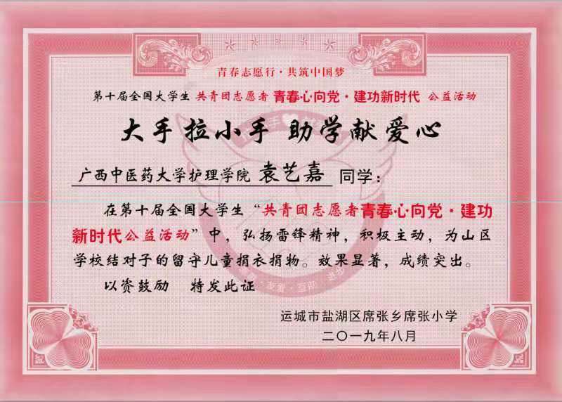 2019年8月,点点体育收到一封来自运城市盐湖区席张乡席张小学对点点体育18级护理学3班学生袁艺嘉参加“第十届全国大学生共青团志愿者 青春心向党,建功新时代 ”公益活动的感谢信,和两面感谢点点体育团委、点点体育青年志愿者协会“爱心服务进山区”“关爱留守儿童”的锦旗。