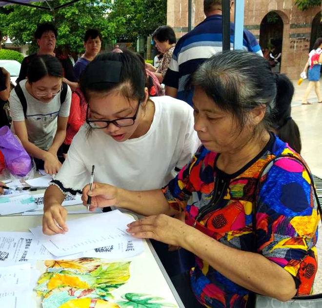 队员们帮助来往的行人填写问卷