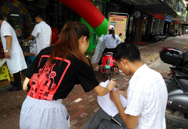 7月15日上午,调查研究队成员前往东方广场。活动以问卷调查为主要形式,此外还有抽奖送小礼品的环节。纵然骄阳在顶,但同学们并不退缩。同学们在东方广场范围内进行问卷调查,并为居民解答他们对问卷含义的疑问。填写完问卷的居民都得到了相应的小礼品。在对参加活动的居民进行的采访中,我们本次的社会实践活动得到了当地居民的赞扬。