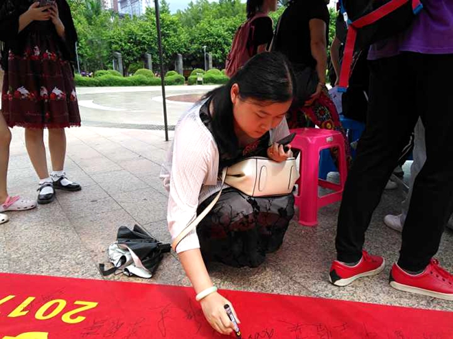 参与者在横幅上签字