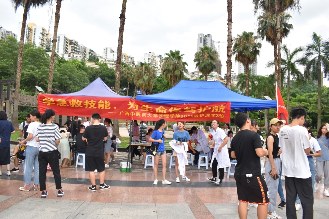 为响应团中央“青春心向党,建功新时代”的号召和taptap点点体育关于进一步加强大学生暑期社会实践活动有关要求,2019年7月5日下午,2018级护理学3班在南宁市青秀区天池山广场开展了以“学急救技能,为生命保驾护航”为主题的暑期社会实践活动。班主任葛圆老师作为指导老师带领2018级护理学3班79位同学参加此次活动。