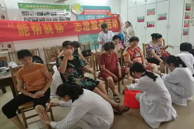 7月14日上午,队员们冒着倾盆大雨按时抵达望州南小区,社区的叶书记热情的接待了QQ星智慧团并给队员们介绍了社区里面老人的活动情况方式,通过叶书记的介绍我们大致了解了老人们日常的活动情况。随后,叶书记带领我们去到了老年活动中心,QQ星智慧团的成员们开始了打扫卫生的志愿服务活动。通过队员们一个上午的努力,原本凌乱的老年活动中心焕然一新、整整齐齐,队员们的付出给老人们营造了一个干净整洁的活动环境。14日下午,QQ星智慧团来到了望州南养老服务中心,在养老中心开展了健康义诊活动。经过养老中心主任积极的宣传,不少老人纷纷来参加活动。通过开展量血压、艾灸和手法等活动,让老人们感受到队员们的关爱。在义诊的过程中,我们与老人深入交流,更加详细的了解到了老人的情况。其中一位奶奶在义诊后表示自己肩膀上的肌肉之前一直酸痛,在义诊后得到了极大的缓解,她非常感谢我们队员提供的义诊服务。对此,队员们感到十分高兴,活动最后,队员们以大合照的形式结束了此次活动。