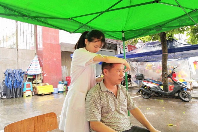 在陈文雅老师的指导下,全体成员分为三组。第一组成员为当地居民提供手法按摩、艾灸、刮痧和血压测量等服务;第二组成员向当地居民介绍有关的中医中药知识,发放制作的中药方剂手册;第三组成员负责咨询台的工作,耐心地为当地居民答疑解惑、免费赠送太极藿香正气口服液。下午,各小组代表有序地开始前往附近的居民家进行走访并提供义诊服务。义诊期间,陈文雅老师的现场指导和示范,为我们做出了良好的实践榜样。活动过程中,团队成员积极主动的服务态度以及专业耐心的解答,得到了当地居民的一致称赞和认可。