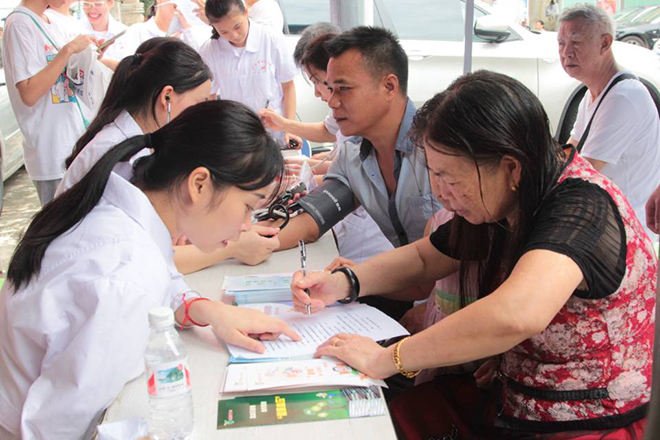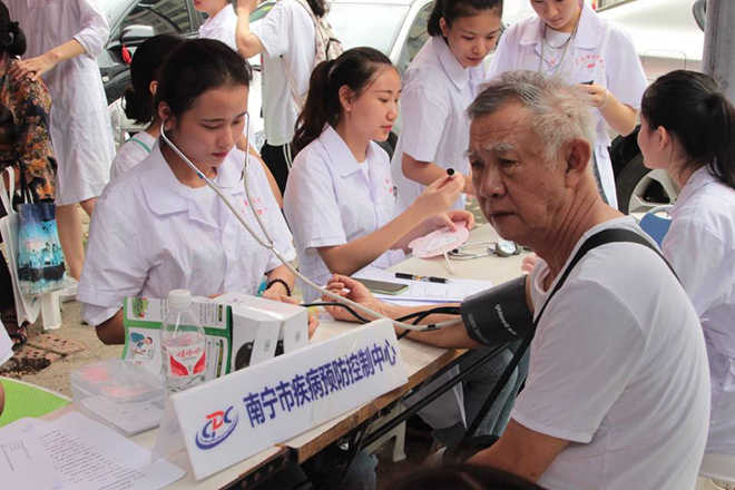 南宁疾病控制中心的专家一一解答村民的疑问,为村民讲解预防高血压病的重要性。同学们为村民们量血压、艾灸、推拿按摩,得到村民的点赞。