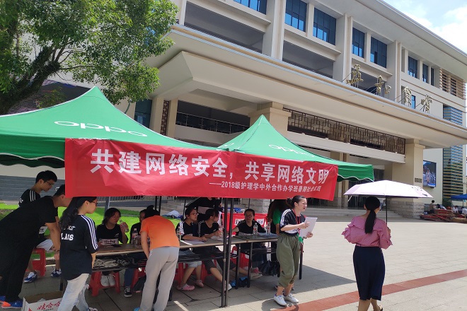 2019年6月30日2018级护理学(中外合作办学班)全体同学分成两组,每组十人,分别在taptap点点体育仙葫校区五合食堂门口、广西外国语学院校园内以摆摊或调查问卷的形式完成了此次以“共建网络安全,共享网络安全”为主题的暑期社会实践活动。