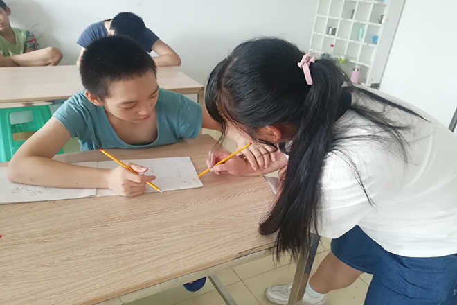 虽然天气十分炎热,但成员们的热情丝毫不减,脸上的汗珠不断滚落,背上的衣布逐渐湿透,仍在认真的打扫,争取做好康复中心防洪工作。室内的成员们则是认真的与这些孩子进行交流,十分耐心的进行教导。本项目活动开展形式多样,不仅是物质层面上的直接服务,更注重精神层面上的服务,用我们所学的知识对脑瘫儿童进行言语训练、社交训练、认知训练等,让脑瘫儿童能更好的融入社会。