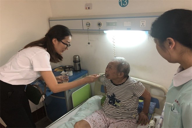 “百善孝为先”,尊老敬老爱老是中华民族的传统美德。小分队队员热情的陪老人说话,聊天,询问着老人的健康状况,整个护养区充满了欢声笑语。与老人建立信任关系后,对留置胃管的老人进行吞咽筛查与指导,发挥护理研究生的专业特色,保证老年人吞咽的安全性和有效性,预防不良结局的发生,以实际行动关爱老人、贴近老人、服务老人、造福老人;同时迎合社会热点,是“互联网+护理服务”走进养老院的一次初步尝试,为进一步扩展志愿护理服务范围、护理服务内容积累经验;此外,通过本次活动提高养老院照护人员吞咽管理的专业性和安全性,建立微信群、微信公众号,提供延续性吞咽指导志愿服务。