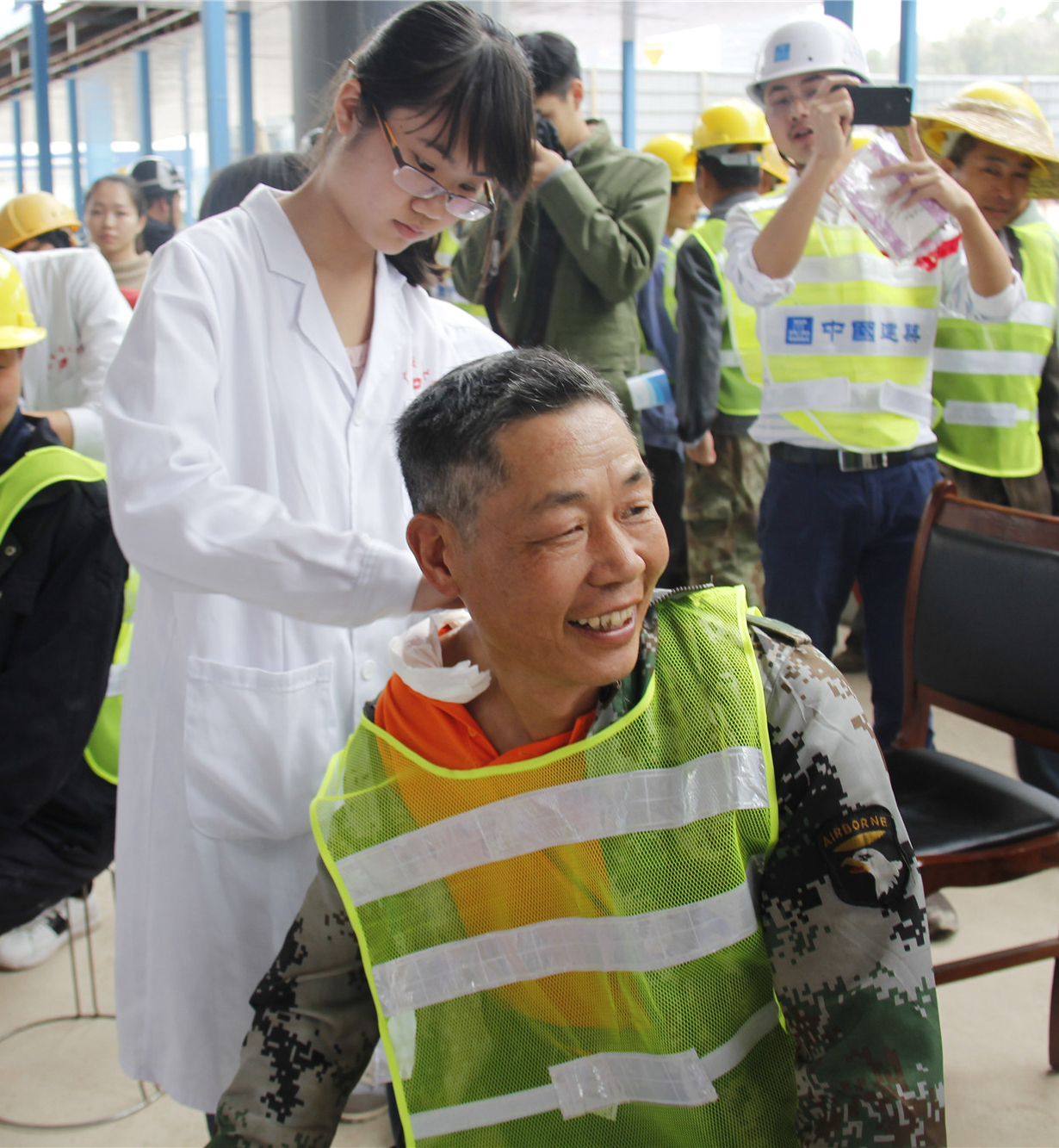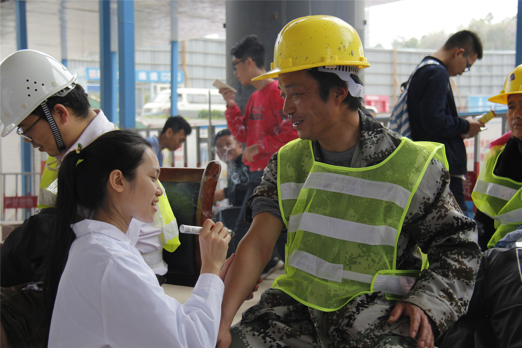 本次义诊有量血压这样的基础体检项目,还有手法推拿按摩、拔罐、刮痧、艾灸和针灸等传统中医项目,以及现场演示心肺复苏术、伤口包扎的急救操作,向工人们宣扬助与自助的理念,让工人们懂得采取正确的方法处理工地上的突发意外。温热的艾灸温暖了工人们的心,颇有力道的推拿按摩舒缓了他们紧张的神经,工人们原本疲惫的脸上都露出了轻松愉悦的笑容。