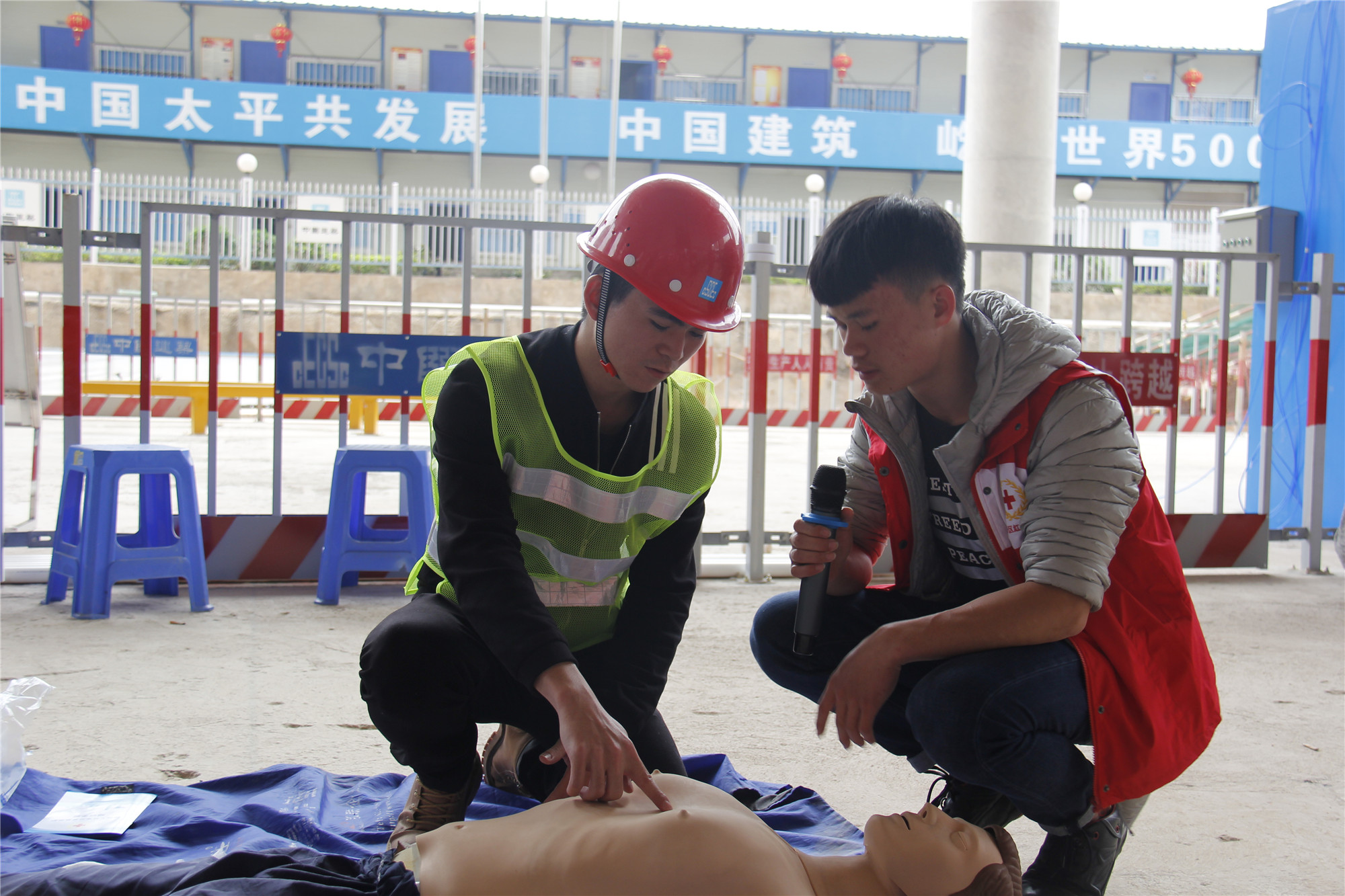志愿者指导工人学习心肺复苏术