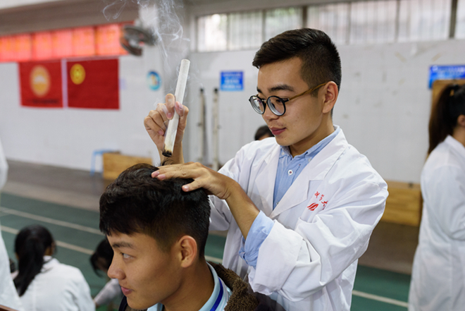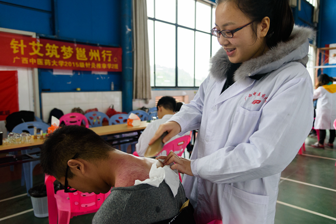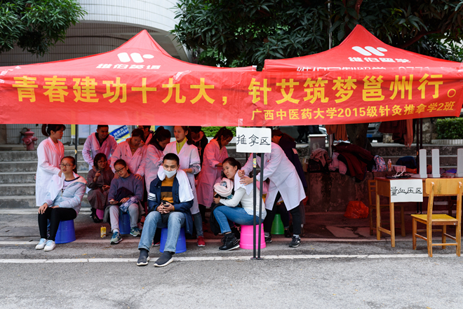 18日下午,15针推二班的同学们在班主任侯小红老师的带领下,开启了义诊的第一站——广西交通职业技术学院。期间,同学们通过运用针灸、推拿、刮痧等中医特色诊疗手法,让更多人了解、体验了祖国医学的伟大魅力之所在,迸发出了中医学子践行十九大精神、凝聚青春力量的蓬勃朝气。