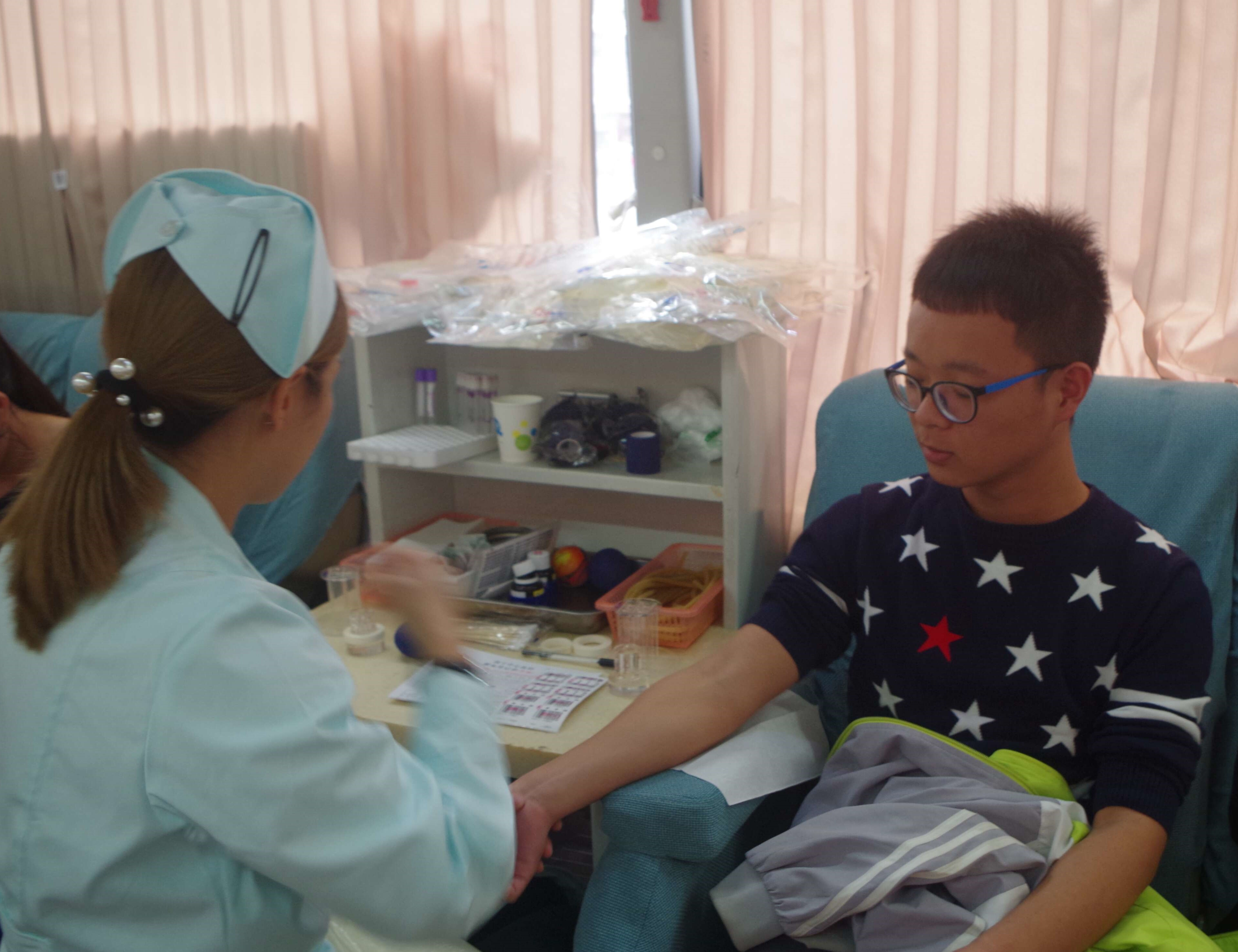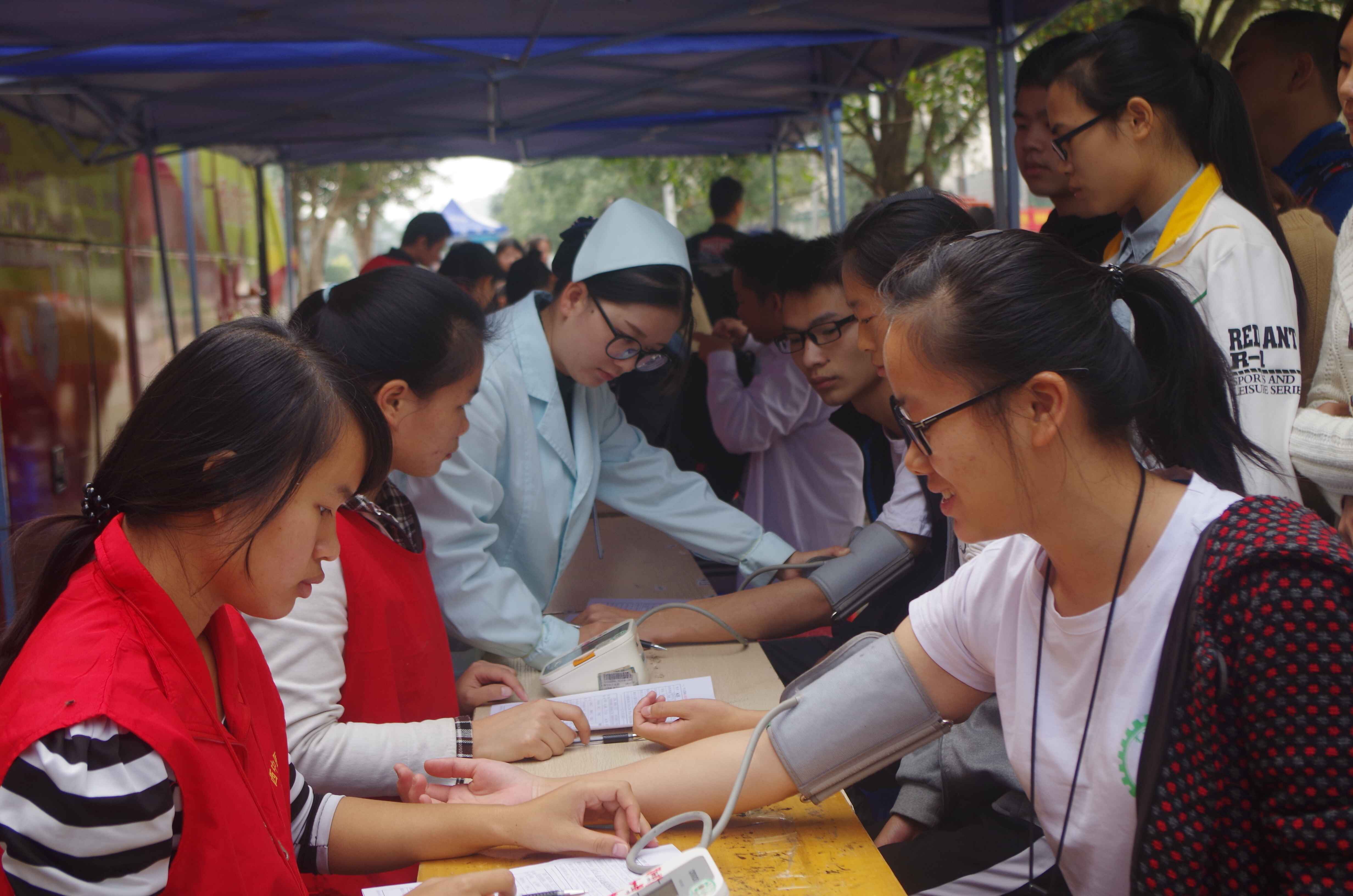 上午十点,已经有不少同学等待着献血。医生在志愿者们的配合下,很快开展献血活动。医生们为大家检验血液、采集血液,志愿者们进行献血知识宣传、造血干细胞知识宣传、指导填写报名表、递送糖水等为大家服务。不久,活动现场便排起了长龙。在等待的过程中,大家围坐在一起聊天以缓解献血带来的紧张情绪。下午5时,在活动即将结束时,还有不少的同学前来询问填写报名。