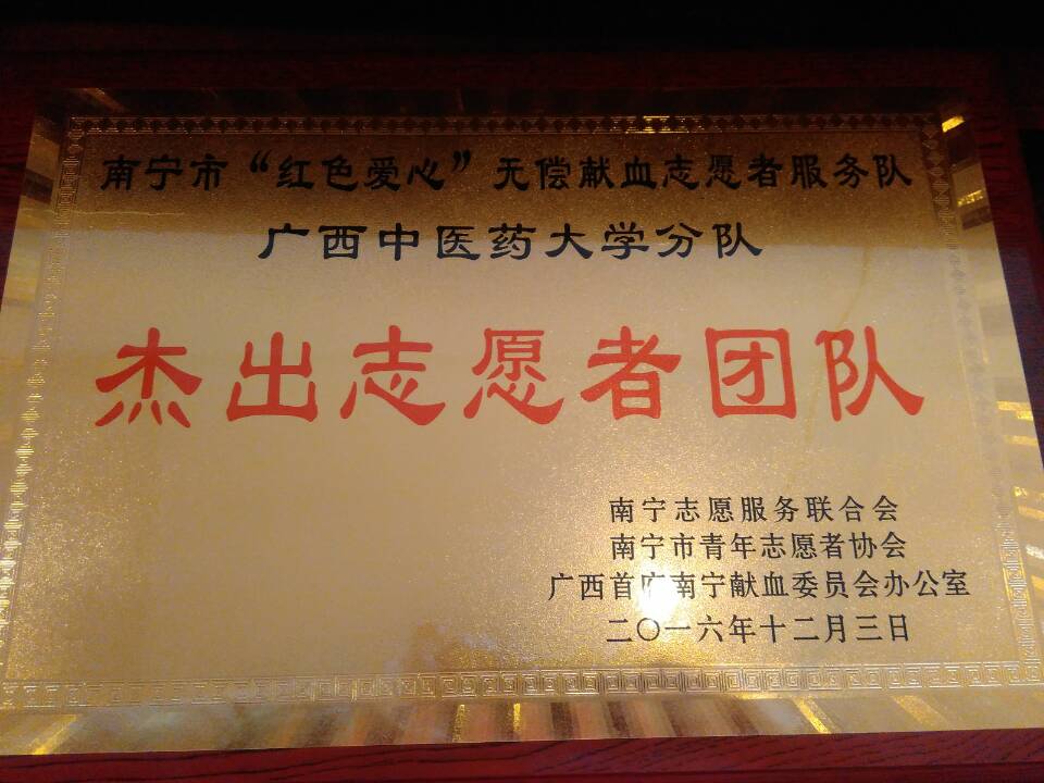点点体育大学生红十字会2016年“血车进校”活动也于今天结束,南宁市“红色爱心”无偿献血志愿者服务队点点体育分队荣获南宁市“杰出志愿者团队”荣誉称号。