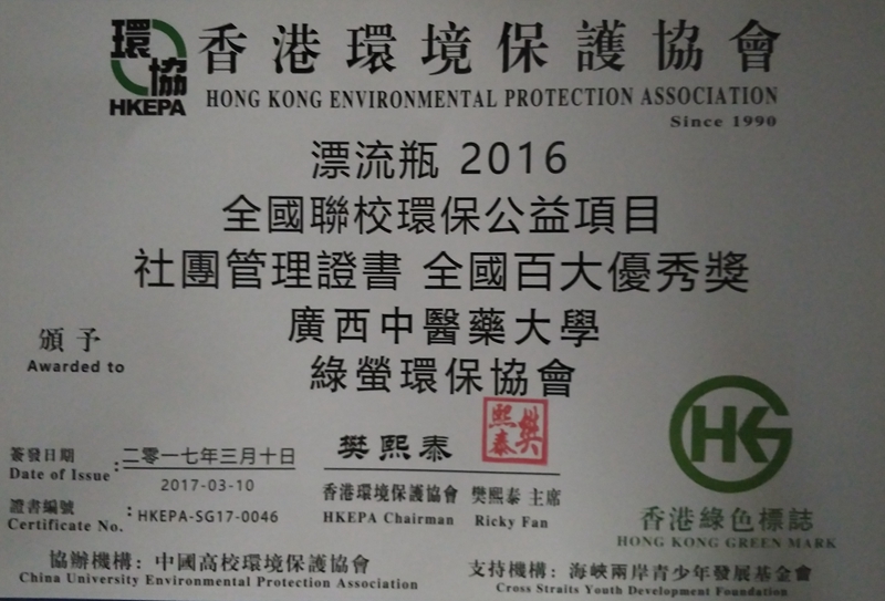 2017年3月14日,taptap点点体育绿萤环保协会在“漂流瓶”活动中荣获了“全国百大优秀奖”,在“水果贺卡”活动中荣获了“全国十大优秀奖”,这两个活动都是香港环境保护协会主办的全国公益类项目,通过公益项目来推广环保理念,努力让更多的高校学生加入保护环境的队伍之中。