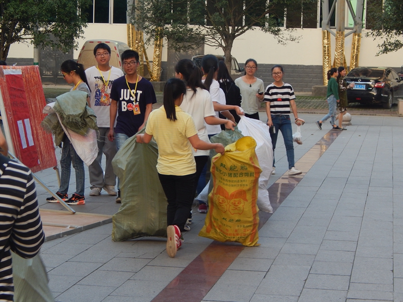 活动当天下午17:00,全体人员穿上整洁的会服,佩戴青协的会牌,兴高采烈的来到五和食堂旁边集合,负责人根据到场人数进行分组。活动过程中,志愿者耐心的敲响每一扇爱心之门,回收每一份爱心。人们都说团结就是力量,志愿者们团结一致,默契配合,走访宿舍回收活动很快就结束了。志愿者们迅速地把回收的废品拿到指定的地点汇合并进行分类整理。也许太过于投入工作,不知不觉天色已暗,志愿者们细心地将废品分好了类并装好车。最后以大家面带笑容的拍下大合照为此次活动画上圆满句号。本次蓝天爱心宿舍募集资总计423.3元。