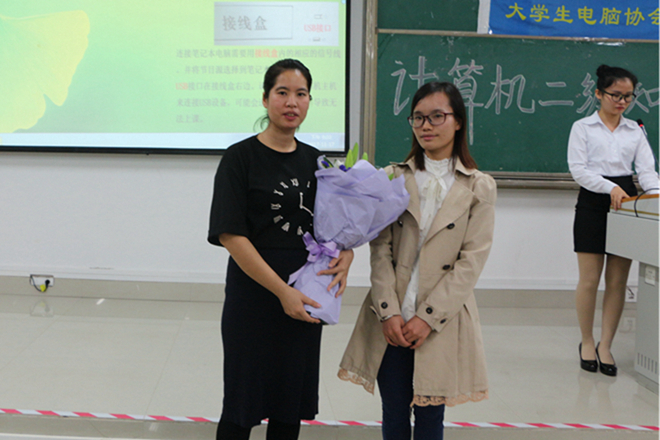 晚上19:00讲座正式开始,本次讲座有三个环节:讲解环节、献花环节、合影环节。讲座初始,蒋玲艳老师从考试的形式、时长、内容以及分值等方面进行讲解,让同学们对计算机二级考试有了初步了解。在讲座中,蒋玲艳老师给同学们详细地讲了高级OFFICE的使用,并分别结合考试大纲中的要求,着重分析了各类题型的答题注意事项和技巧。蒋玲艳老师还对同学们在考试中可能遇到的特殊情况以及同学们容易忽略的地方进行了重点分析,并向同学们现场演示正确操作,“理论”与“实践”的结合让同学们印象深刻。