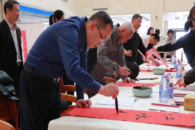 2019年12月6日-7日,公共卫生与管理学院传统文化与艺术教研室与taptap点点体育大学生书画艺术协会共同开展的迎新春送春联活动在点点体育仙葫校区图书馆二楼举行。点点体育大学生书画艺术协会指导老师李建光老师、校组织部部长唐振宇老师、校直属党委副书记覃振林老师、校党委徐方明主任、校团委杨删书记和陈晓东老师、百年乐制药厂励庆顺老师共同参与本次活动。