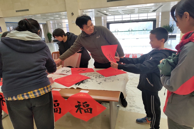 李建光老师、唐振宇老师、覃振林老师、励庆顺老师在活动现场现场挥毫泼墨,为全校师生写春联。徐方明主任、杨删书记和陈晓东老师也在活动现场进行指导,纷纷对书画协会此次的送春联公益活动的赞赏有加,鼓励并支持书画协会举办更多相关活动。