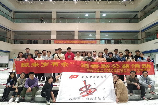 活动现场笔墨纸砚齐备,师生们一起写春联、写“福”字、剪红纸,共享“鼠”于桂中医喜迎新春的乐趣,共同将一首首赞美幸福生活、寓意美好吉祥的诗句写在喜庆的春联上,浓浓的年味随之而来。