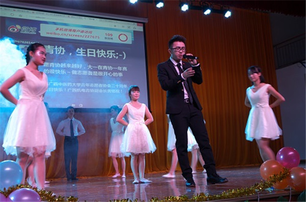 伴随着观众热情的欢呼声,广西高校志愿者联谊晚会暨taptap点点体育青年志愿者协会成立20周年晚会在时尚与环保相结合的开场秀——《环保时装秀》中拉开了序幕。在老师及青协现任负责人的发言后,晚会正式开始了。青协各前任会长们将对青协的深情融入到《最美的时光遇到你——青协》中,表达了志愿者对青协的爱与依恋;青协的志愿者们通过表演小品《一家人》来呼吁大家一起加入关爱老人的队伍中;吴睿老师演唱了《夜空中最亮的星》,借以为路人指明道路的明星来比喻永恒不变的志愿服务精神,并赞美了志愿者的无私奉献;《爱留下,守护他》在表演者的精彩演绎下,体现了关爱留守儿童这一深刻主题;其他由校内外各兄弟社团表演的节目,也展示了当代大学生的青春与活力。真正掀起晚会高潮的是纪念青协成立20周年生日蛋糕的出现,大家不约而同地高唱生日快乐歌,为青协送上最诚挚的祝福。最后,在全体合唱会歌《爱就在身边》的歌声中,此次晚会圆满地落下了帷幕。