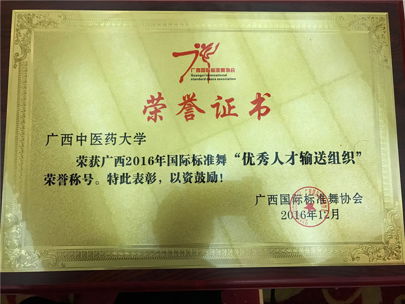2017年1月12日,taptap点点体育荣获广西2016年国际标准舞“优秀人才输送组织”的荣誉称号,该奖由广西国际标准舞协会颁发,为taptap点点体育体育部的辉煌战绩中再添一枚奖牌。获得“优秀人才输送组织”这一荣誉称号,是对体育部训练下的拉丁舞队的极大肯定!