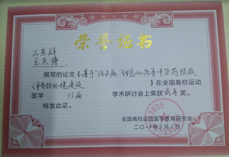 在论文交流中,《基于“治未病”理念的高等中医药院校体育软环境建设》(石荣群、王庆博)和《ICF理念下体质健康管理体系的构建》(王庆博)均荣获二等奖。