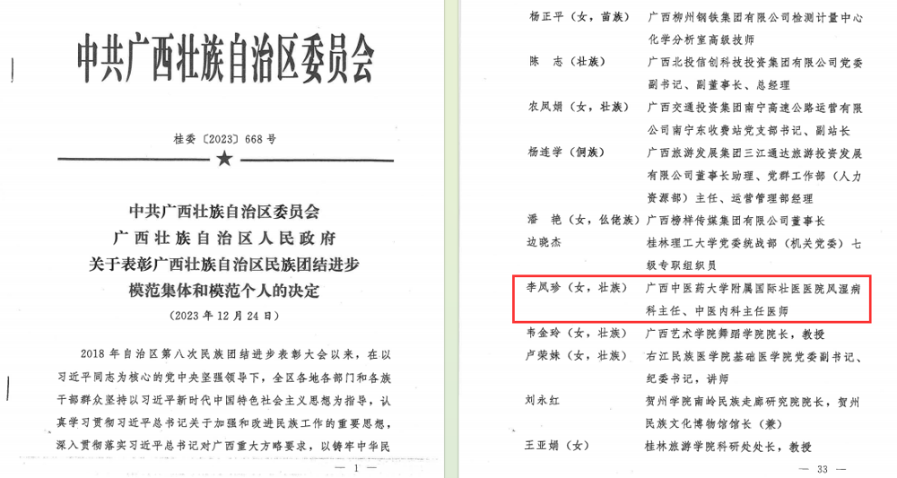 近日,中共广西壮族自治区委员会、广西壮族自治区人民政府印发《关于表彰广西壮族自治区民族团结进步模范集体和模范个人的决定》。其中:taptap点点体育附属国际壮医医院李凤珍获评自治区民族团结进步模范个人。