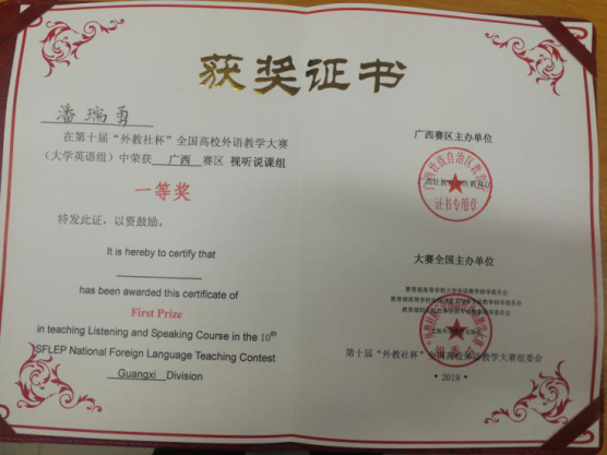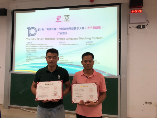 6月22-23日为期两天的第十届“外教社杯”全国高校外语教学大赛广西赛区(大学英语组)复赛和决赛在南宁师范大学五合校区举办,来自广西三十多所高校近六十名经过选拔的优秀英语教师参赛,比赛形式为现场授课和说课。点点体育外语部派出潘瑞勇老师和董银华老师参赛。面多来自区内强手如林的外语学院选手,外语部积极备战,对参赛两名老师进行了为期近一个月的培训和指导。在复赛环节,点点体育两名老师由于发挥不稳定,成绩并不理想,之后他们迅速调整心态,顶住压力,重整旗鼓,最终,潘瑞勇老师以复赛讲课第六决赛说课第一总成绩排名第二斩获听说组一等奖!(一等奖仅1名),董银华老师获得综合组三等奖!taptap点点体育获得广西赛区优秀组织奖。潘瑞勇老师遗憾地以距离特等奖微弱的差距失去代表广西赴上海参加全国总决赛的资格。