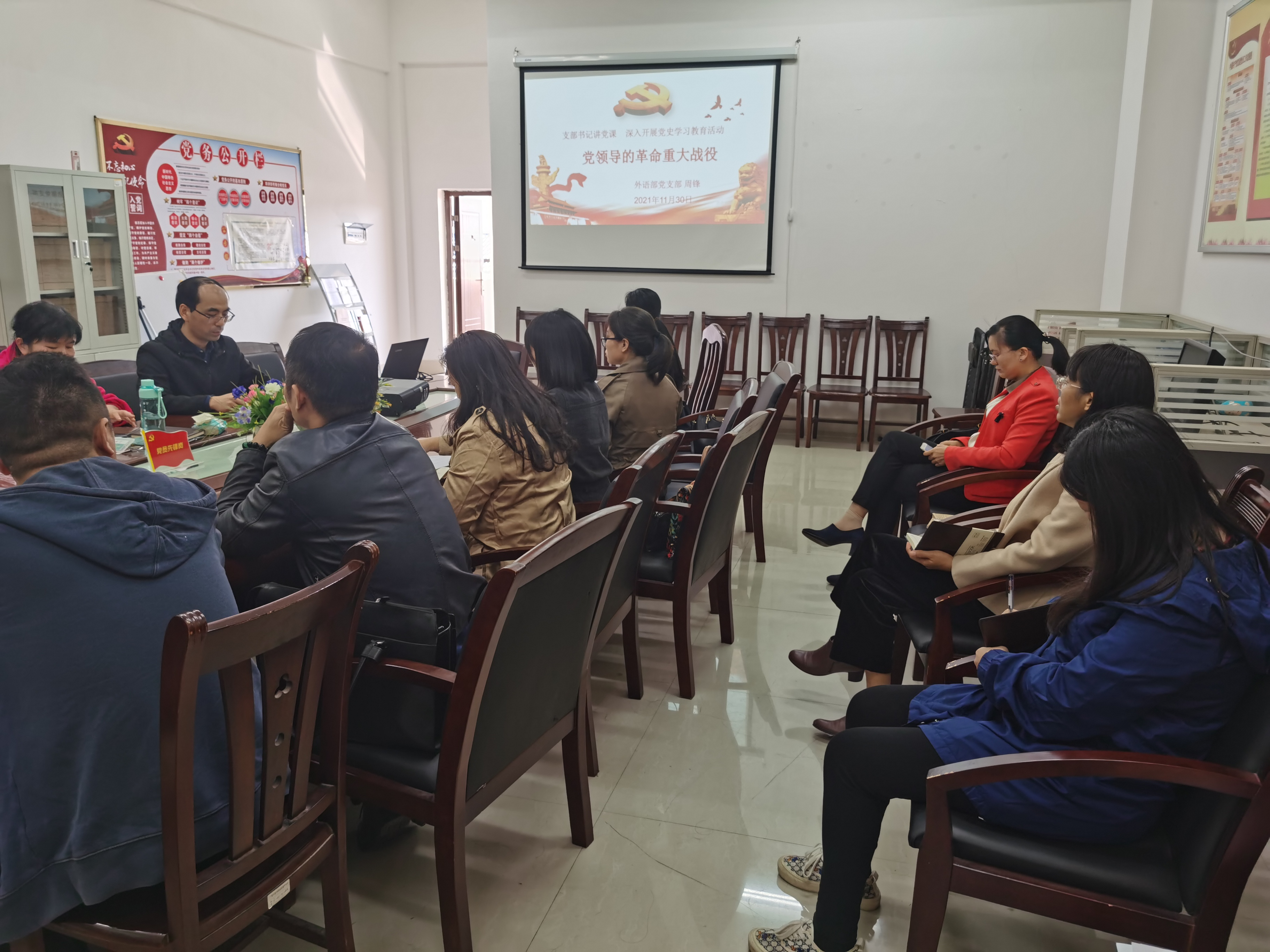 2021年11月30日下午,外语部召开党员大会,大会有三项内容,一是学习党的十九届六中全会精神,二是“支部书记讲党课”,三是“我为群众办实事”交流。