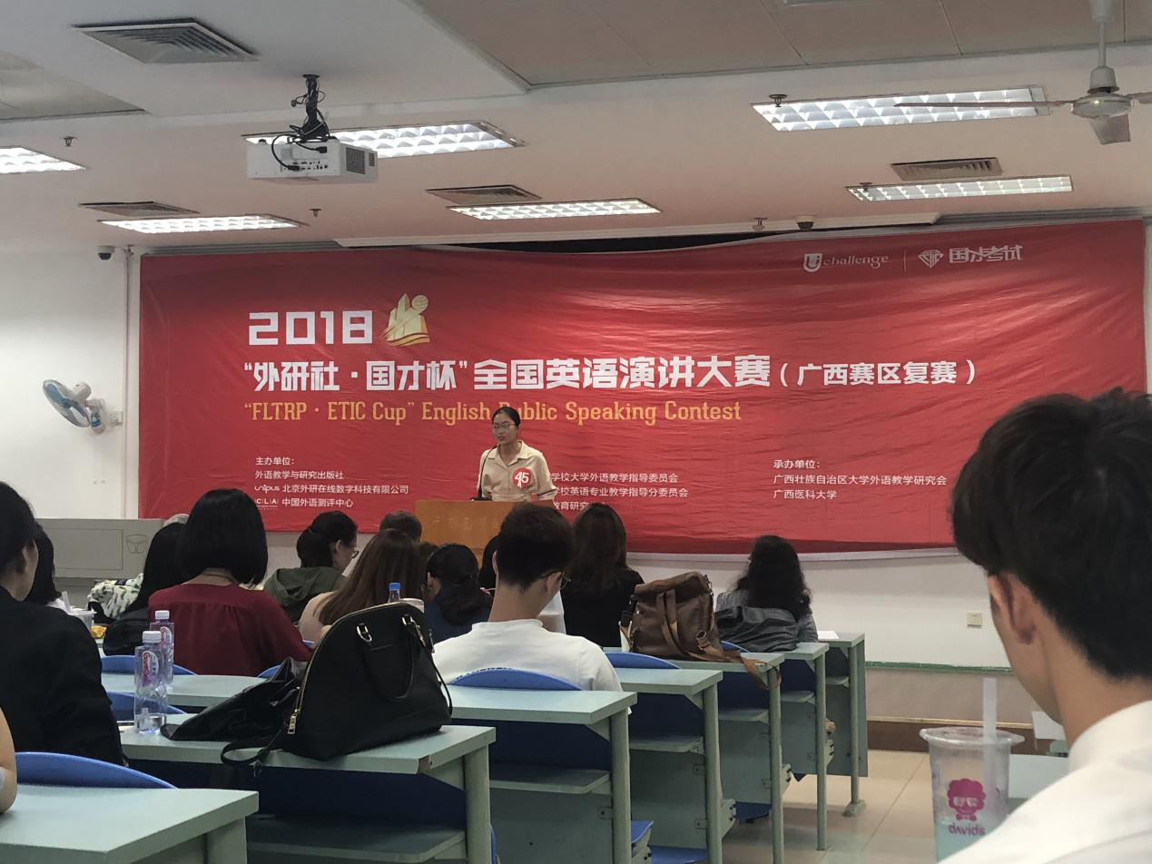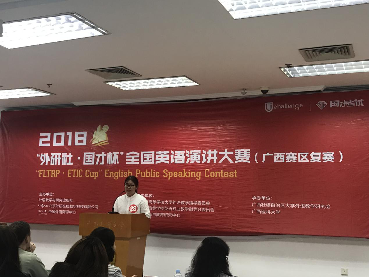 10月28日,2018年“外研社.国才杯”全国英语演讲大赛(广西赛区复赛)在广西医科大学举行,点点体育派出陈雯悦和甘佳丽两位同学参赛,其中2017级口腔医学专业的陈雯悦同学在这次比赛中取得了三等奖。