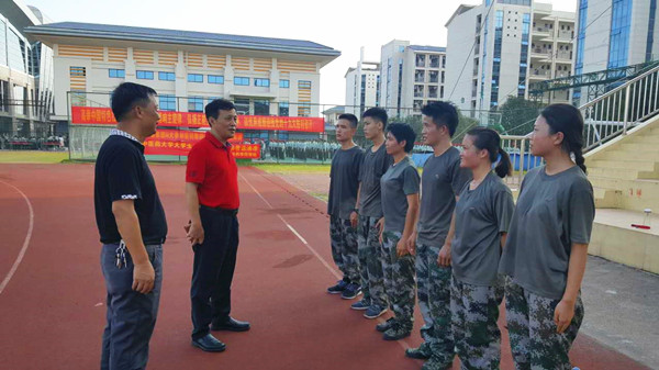 为鼓励代表广西参加2017年度军事课教学展示比赛学生,9月21日上午,学校党委副书记董塔健、武装保卫部部长冯第林到仙葫校区训练场,为他们壮行。