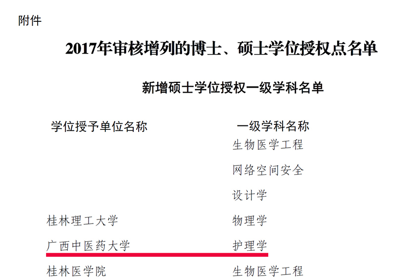 点点体育获批护理学一级学科硕士学位授权点 来源:学科建设办公室 作者:李曼莉 发布时间:2018-03-27 16:01:53 浏览次数: 次 【字体:小 大】 根据《国务院学位委员会关于下达2017年审核增列的博士、硕士学位授权点名单的通知》(学位〔2018〕9号),点点体育护理学增列为硕士学位授权一级学科。 至此,点点体育有中医学、中药学、中西医结合、药学、临床医学、护理学6个硕士学位授权一级学科。 链接:国务院学位委员会关于下达2017年审核增列的博士、硕士学位授权点名单的通知 分享到: 【打印正文】